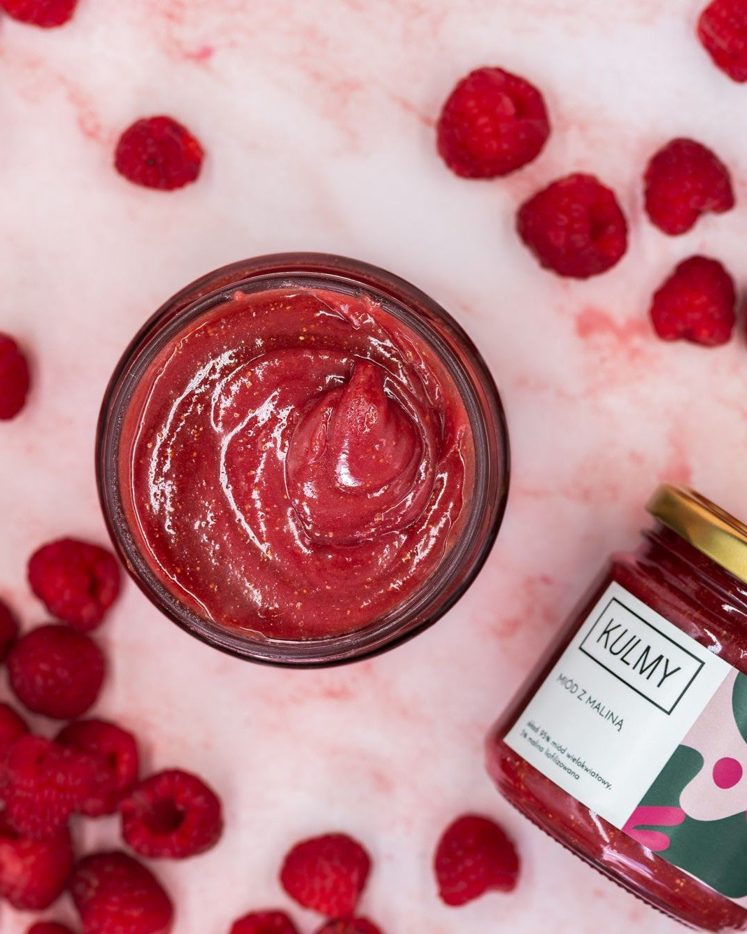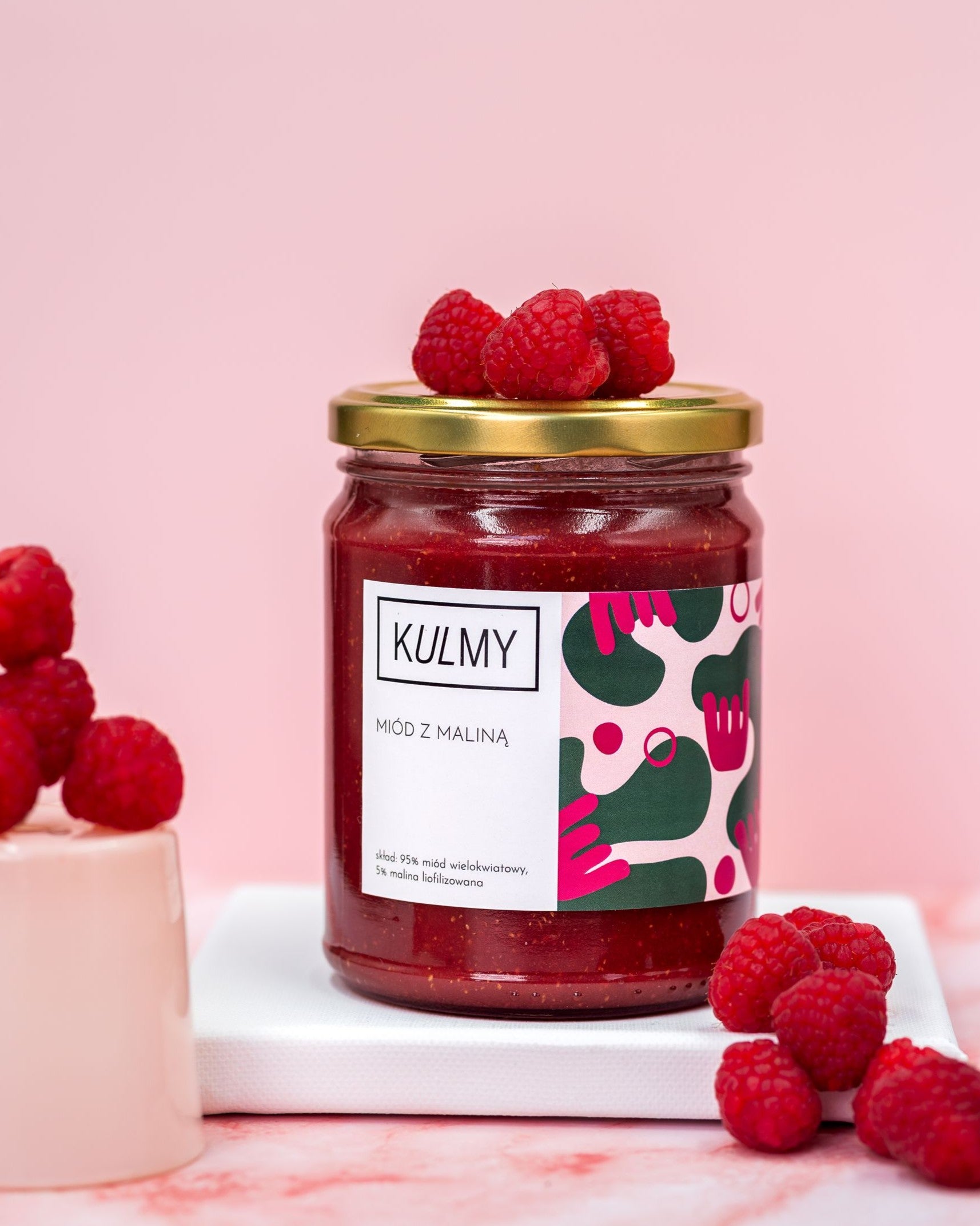MIÓD Z MALINĄ OD KULMY Malina – tego owocu raczej nikomu nie trzeba przedstawiać. Jest stale obecny w naszym życiu, a smak malinowy towarzyszy nam od wczesnych lat dziecięcych w najróżniejszych formach. Maliny są powszechnym i uniwersalnym owocem, który można dodać w zasadzie do wszystkiego, a przede wszystkim wcinać świeżo zebrane. Wybór był oczywisty – musiał powstać miód z maliną. JAK SMAKUJE Jeśli ten obrazek z dzieciństwa dał Ci ukojenie, to dodawaj miód z maliną do koszyka bez wahania. Kremowany miód wymieszany ze liofilizowanymi malinami jest gładki, ciągnący. Tu się wszystko zgadza – przepiękny, różowy kolor zapowiada słodycz, której jest w tym miodzie po brzegi. Jest też odrobina kwaskowości z malin, na przełamanie nadmiaru słodyczy. Jest w końcu miód wielokwiatowy, który sam w sobie jest doskonały. No i konsystencja… jednolita, miękka, jak chmurka na języku. Sama rozkosz. DLA KOGO Miód z maliną to niekwestionowany ulubieniec wszystkich dzieci, a także dorosłych, którzy nie zapominają czasem być dziećmi. To propozycja dla wszystkich, którzy potrzebują otulenia, błogości i szczęścia. Idealna równowaga słodyczy i kwaskowaty posmak, sprawia, że każdy znajdzie w słoiku swój wymarzony smak.