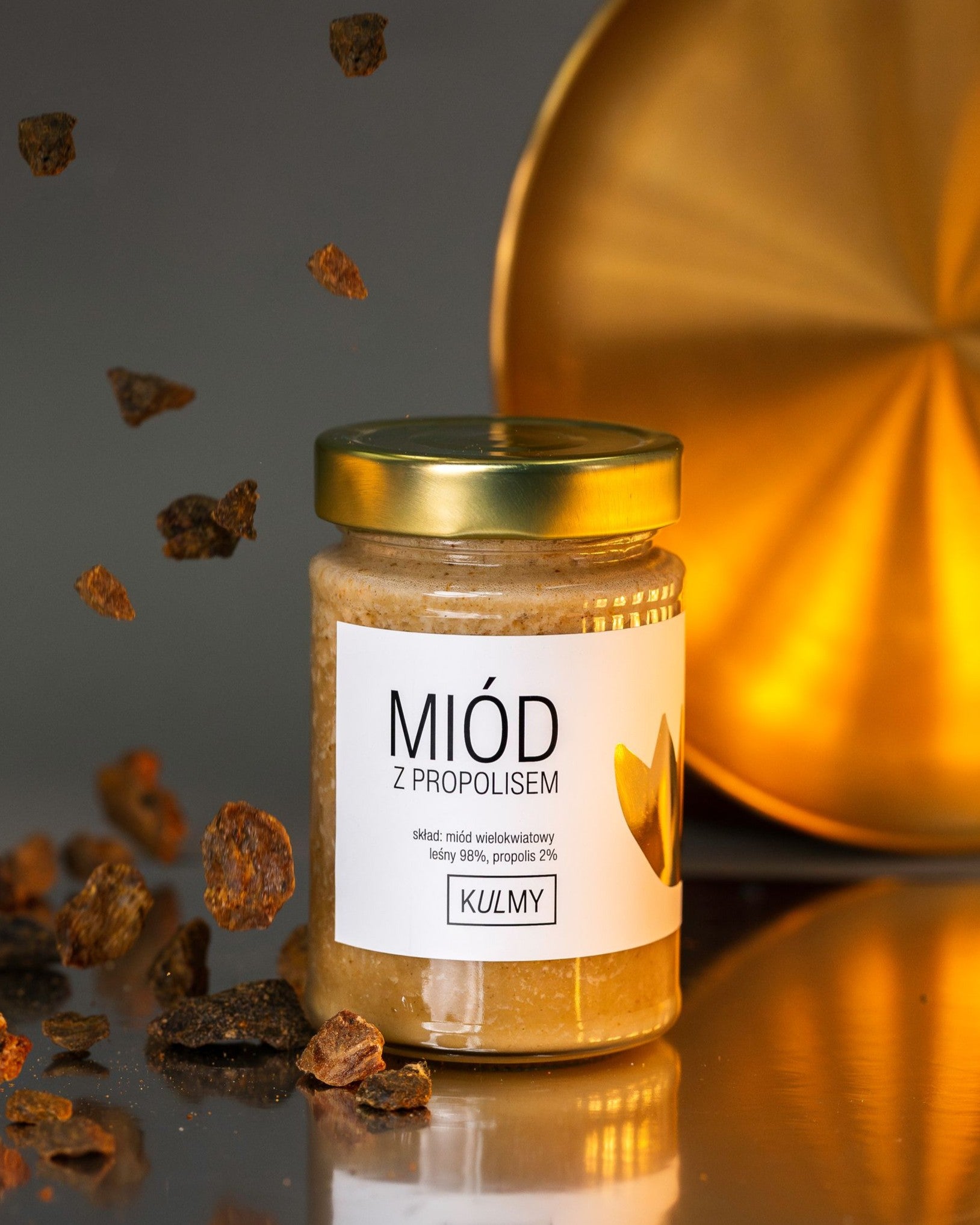 MIÓD Z PROPOLISEM OD KULMY Tegoroczny rozlew miodu z propolisem to zwiększona dawka propolisu, dzięki czemu miód ma jeszcze bardziej żywiczno-orzechowy posmak. Jego kremowa konsystencja, drzewny aromat, to wyróżnik tego miodu. Propolis, który jest zawarty w miodzie, to świetny naturalny stymulator do budowania odporności – pszczoły powlekają nim cały ul w środku, aby chronił je przed zarazkami. Dla ludzi ta substancja również może zdziałać niemało dobrego! Propolis to żywiczna substancja z pąków drzew i krzewów. Pszczoły zbierają go od wiosny do końca jesieni. Pszczela zbieraczka wybiera na to ciepłe dni, aby substancja była jak najbardziej plastyczna. Dodatkowo też pszczoły przeżuwają propolis, aby ułatwić jego transport. Pszczoły powlekają propolisem całe wnętrze ula oraz używają go jako środka dezynfekującego. Dzięki niemu budują system odporności, a wewnątrz ula panują idealne warunki do życia. POŁĄCZENIE MIODU Z TAK CENNYM PROPOLISEM Miód jest naturalnym środowiskiem dla propolisu. Dzięki niemu propolis uwalnia swoje właściwości oraz staje się łatwiej przyswajalny. Smak miodu naturalnie komponuje się z wyrazistym , przyprawowym charakterem propolisu, dzięki czemu mieszankę można jeść prosto ze słoika. JAK SMAKUJE Zdecydowanie ostrzejszy w smaku, pachnący mocno ulem. Ten miód nie tylko lepsze właściwości, ale i głębszy smak. Jeżeli szukasz ciekawych doznań, to miód z propolisem będzie nowym odkryciem.