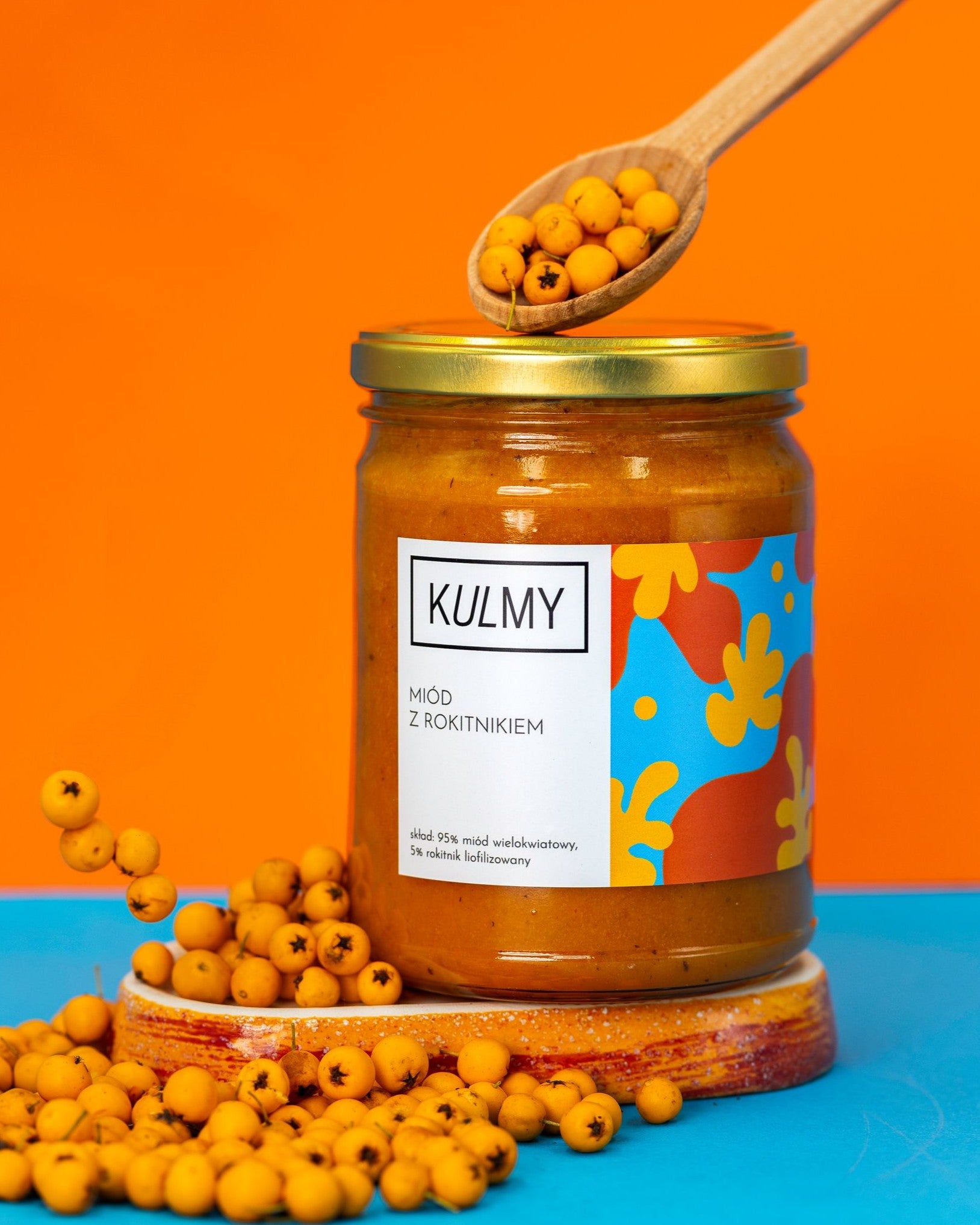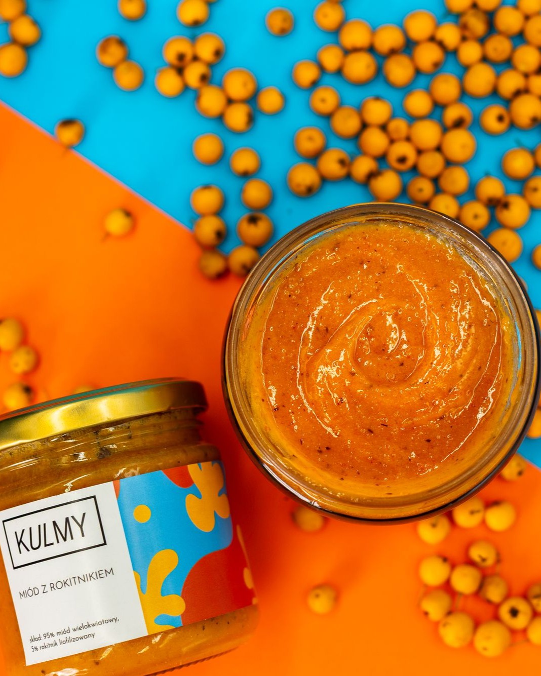 MIÓD Z ROKITNIKIEM OD KULMY Rokitnik to krzew z rodziny oliwkowatych, którego gałązki każdej jesieni są gęsto oblepione pomarańczowymi kuleczkami. Te małe skarby po brzegi wypełnia witamina C, a jej poziom nie spada nawet po mrożeniu czy liofilizowaniu [1]! Rokitnik, zwany też oblepichą, nie jest szczególnie częstym gościem w naszych kuchniach, ale czujemy, że to się szybko zmieni. To prawdziwy superfood! Sam w sobie jest bardzo kwaśny, dlatego robimy z niego kompoty, nalewki oraz dodajemy do innych potraw. JAK SMAKUJE Miód, by dobrze i równomiernie połączył się z liofilizowanym rokitnikiem, został poddany kremowaniu w niskiej temperaturze. Zabieg ten nie wpływa na właściwości miodu, ale zmienia jego konsystencję w taki puchaty krem. Rokitnik zapewnił obłędny energetyczny kolor i drobinki owocowe, które tworzą bardzo przyjemną dla języka fakturę. Smak miodu wielokwiatowego jest wyrazisty i intensywny, dlatego jest tu równorzędnym partnerem. Kwaśny rokitnik wspaniale się z nim łączy, dodaje mu jeszcze więcej głębi i nuty z kompletnie przeciwnej skali. Dodaje też taki ciepły, delikatnie owocowy smak i aromat. Miód z rokitnikiem ma już u nas zdecydowanych fanów, którzy wyjadają go prosto ze słoika. Dzięki pięknemu kolorowi i równowadze kwaśnego i słodkiego smaku będzie świetnym dodatkiem do deserów. DLA KOGO Dla fanów superfood – szczególnie, jeśli potrzebują witaminy C. My będziemy go jeść cały rok, ale z pewnością warto po niego sięgnąć w przeziębieniowych okresach. No i dla wszystkich miłośników kwaśnych smaków oraz energetyzujących kolorów.